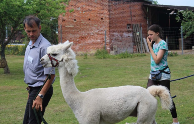 Am Alpakahof angekommen, kann‘s gleich losgehen. Gemeinsam mit den anderen Teilnehmern und den Tierpflegern bereitet Ihr die Tiere auf die bevorstehende Wanderung vor. Jedes Tier bekommt eine Leine zur Führung umgelegt. Zwei davon nehmt Ihr in die Hände und Abmarsch! Eure Alpakas und Ihr startet los hinaus ins Grüne!