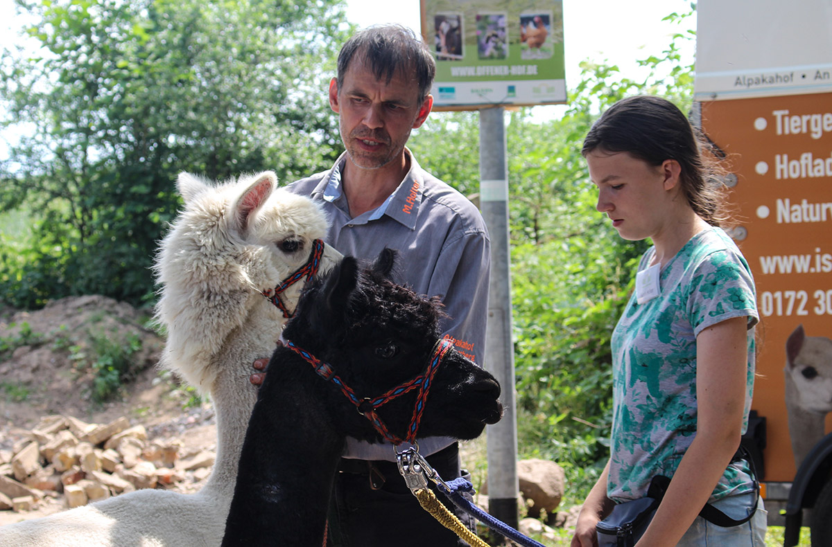 Am Alpakahof angekommen, kann‘s gleich losgehen. Gemeinsam mit den anderen Teilnehmern und den Tierpflegern bereitest Du die Tiere auf die bevorstehende Wanderung vor. Jedes Tier bekommt eine Leine zur Führung umgelegt. Eine davon nimmst Du in die Hand und Abmarsch! Dein Alpaka und Du startet los hinaus ins Grüne!