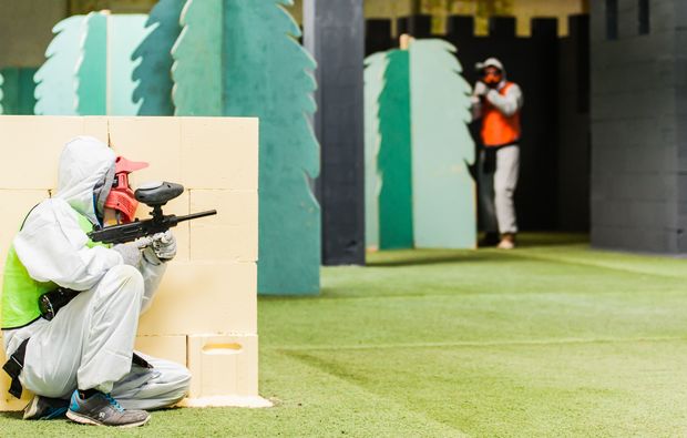 Dann mal nichts wie los: Beim Paintball spielen zwei Teams gegeneinander. Diese versuchen zwei Stunden lang, sich gegenseitig möglichst oft abzuschießen und dabei selbst wenig getroffen zu werden. Doch der farbenfrohe Spielspaß verlangt auch Taktik: Verstecke Dich auf dem Spielfeld hinter dem Kioskhäuschen, hinter dem Lkw oder im Bürokomplex. So findest Du ausreichend Deckung und kannst gezielt aus dem Hinterhalt angreifen. Das Besondere ist: Ihr bekommt für die gesamte Spieldauer Euer eigenes Spielfeld! Handle klug und werde mit Deiner Mannschaft so zum glücklichen Gewinner!