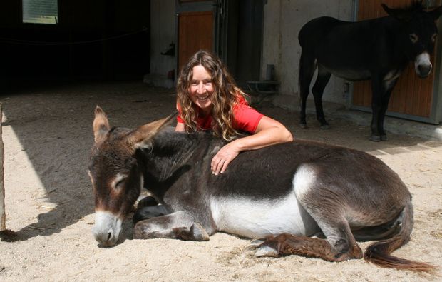 Bei Deinem Erlebnistag mit Eseln lernst Du die Welt der süßen Tiere hautnah kennen. Vom Fachmann erfährst Du alles über ihre Haltung, was die Vierbeiner gerne fressen und wie man sie mit zärtlichen Streicheleinheiten von den Ohrenspitzen bis zur Hufe verwöhnen kann. An der frischen Luft lernst Du die Esel kennen und wirst bald merken, dass die Tiere natürlich auch ihren eigenen Kopf haben. Doch mit den Tipps vom Profi und der einen oder anderen Karotte kannst Du Dich sicher schnell bei den gutmütigen Tieren durchsetzen.