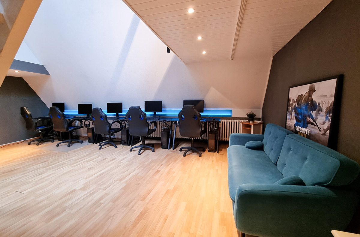 5 voll ausgestattete Gamingplätze, 5 High-End PCs, Highspeedinternet mit 1000 Mbits (Download) und 50 Mbits (Upload)