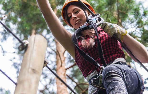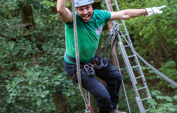 Vorsichtig arbeitest Du Dich durch die unterschiedlich schweren Routen, immer ein Stückchen weiter nach oben, immer ein Stückchen näher an Deine Grenzen. Der Hochseilgarten ist in unterschiedliche Routen mit verschiedenen Schwierigkeitsgraden unterteilt, sodass Du Dich langsam an die schwierigeren Strecken herantasten kannst. Irgendwann wird sicher der Punkt kommen, an dem Du vor einem neuen Hindernis stehst und Dir denkst, es geht nicht mehr. Doch dann überwindest Du Dich und setzt mutig einen Fuß auf das wackelige Hindernis vor Dir. Mit pochendem Herzen arbeitest Du Dich langsam, Schritt für Schritt, über die Strecke. Vor lauter Konzentration auf den nächsten Schritt, merkst Du gar nicht, wie weit du schon gekommen bist. Schließlich setzt Du einen Fuß auf die feste Plattform auf der anderen Seite der Stecke. Voller Stolz kannst Du nun auf das überwundene Hindernis zurückblicken. Glücklich atmest Du tief die frische Waldluft ein und genießt den grandiosen Ausblick durch den Wald. Vielleicht traust Du Dich ja auch gleich an die nächste Herausforderung?