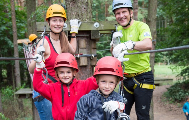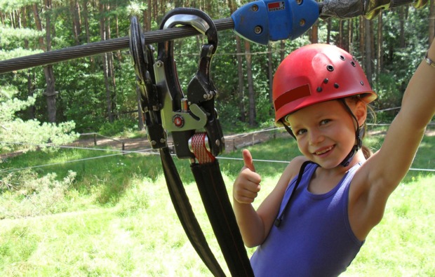 Hoch oben zwischen den Bäumen schlängeln sich die unterschiedlichen Parcours. Lange Stahlseile und verschiedene Hindernisse bilden über Dir ein Spinnennetz, zu dem Du schon sehnsüchtig emporblickst. Doch bevor Du Dich in die Baumwipfel wagen kannst, wirst Du von einem erfahrenen Kletterguide in die Sicherungstechnik der Anlage eingewiesen. Dank des speziellen Sicherungssystems bist Du zu keinem Zeitpunkt ungesichert im Hochseilgarten Beelitz unterwegs. Nach einer kurzen Einweisung in die Kletteranlage kannst Du auch schon Deinen Gurt festzurren und in Dein Kletterabenteuer starten!