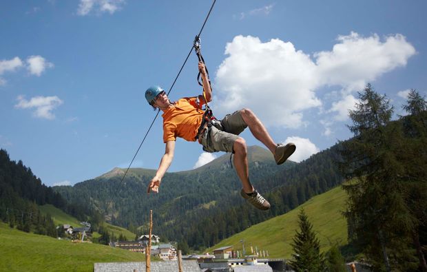Wenn Dir jetzt der Sinn nach noch mehr Nervenkitzel steht, mach Dich bereit für die Erfahrung Flying Fox. Den Blick auf die bewaldeten Hügel der Nockberge gerichtet, steigt auf der Startplattform von Flying Fox in Innerkrems Dein Adrenalinpegel. Der Puls pocht kräftig in Deiner Halsschlagader, wenn Du Deine Karabinerhaken in das Seil einklinkst. Selbstverständlich wird von Deinem Seilgartentrainer alles fachmännisch kontrolliert. Bereit? Stoß Dich von der Plattform ab und flieg los. Stilles Genießen oder Freudenschreie - jetzt ist alles erlaubt. Was für ein Ritt, wirst Du Dir denken, wenn Du auf der anderen Seite im Überschwang der Gefühle ankommst. Das Beste: Es warten bei Flying Fox in Innerkrems noch einmal 300 Meter Rutschvergnügen auf Dich.