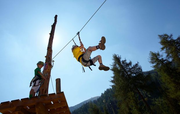 Kletterspaß mit Rutschpartie. Im Hochseilgarten Innerkrems mit Flying Fox kannst Du in malerischer Natur ganz hoch hinaus.