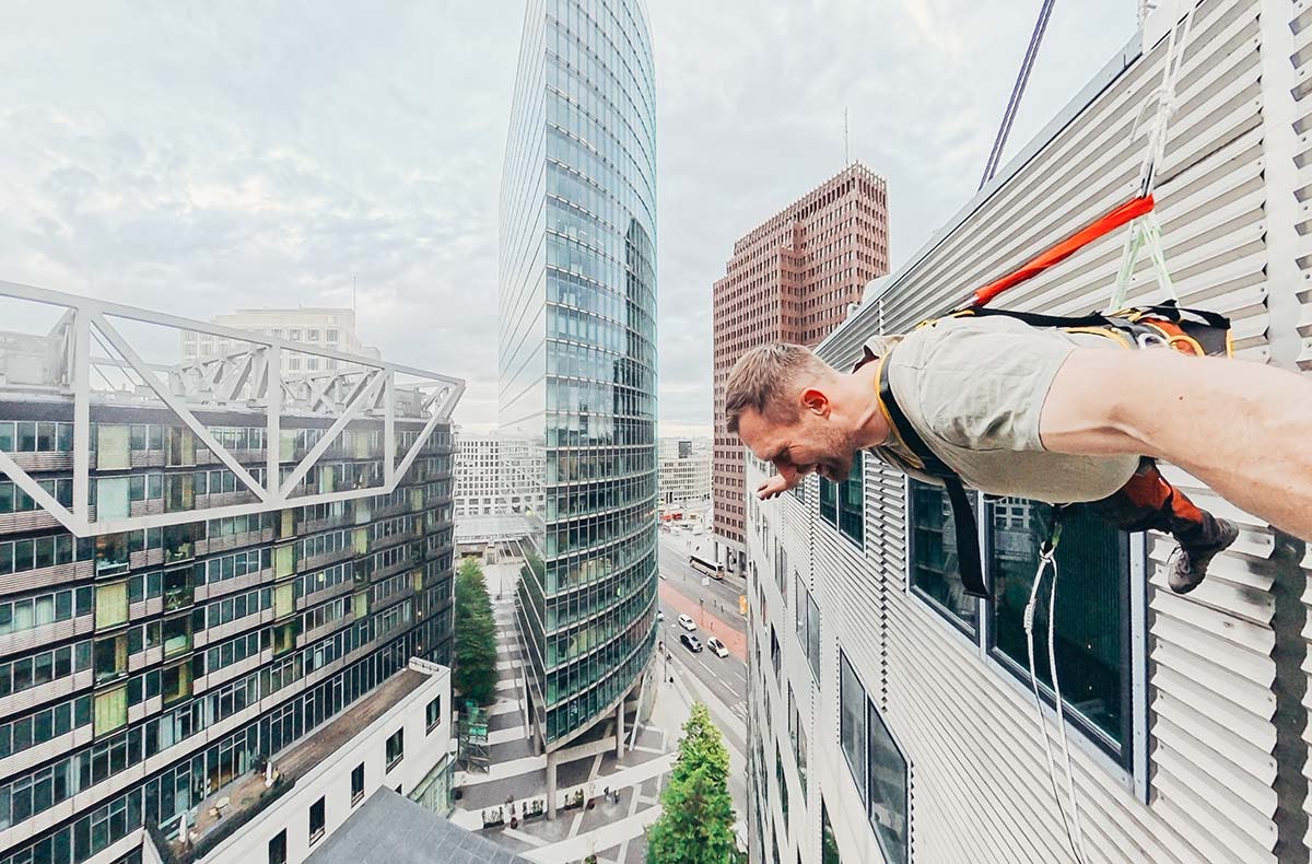 In schwindelerregender Höhe setzt Du den ersten Fuß auf die Dachkante und seilst Dich mit dem Gesicht nach vorn in Richtung Boden. Während Deiner ersten Meter nach unten wird Dir schnell bewusst, das House Running auf 40 Meter kein Schaufensterbummeln ist. Aber als mutiger Absteiger kennst Du keine Grenzen und erst recht keine Angst. Schreite Schritt für Schritt die Wand hinab und beweise absolute Nervenstärke. Was Dein Erlebnis besonders macht, ist der Mega-Kick mit Panorama-Blick. Ganz Berlin liegt Dir zu Füßen und Du genießt unvergessliche Momente, die Dir keiner mehr nehmen wird. Langsam und parallel zum Boden kommst Du sicher und wohlbehalten an Deinem Ziel an. Du blickst nach oben und realisierst den Weg, den Du gerade erfolgreich gemeistert hast. Sowas erlebst Du nicht jeden Tag. Dein ganz persönliches Abenteuer vom House Running dauert etwa 30 Minuten.