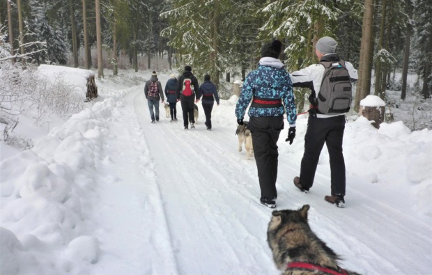 Beim Husky Trekking in Rüthen angekommen, wirst Du bereits mit freudigem Hundegebell und einem Erfrischungsgetränk erwartet. Gleich zu Beginn lernst du Deine Mitwanderer und die Hunde kennen. Du bist sofort vernarrt in die Schlittenhunde mit den eisblauen Augen und der kalten Schnauze. Während Ihr Euch noch gegenseitig beschnuppert, erhältst Du von Deinem Guide eine Einführung in die Ausrüstung, die aus einem speziellen Bauchgurt und einer Hundeleine besteht. Dadurch ist jeder Wanderer mit seinem Husky verbunden und bildet ein unzertrennliches Team. Je nach Körperbau und Kondition wird für Dich der geeignete Hund ausgesucht. Wenn der letzte Teilnehmer seinen vierbeinigen Partner gefunden hat, kann es auch schon losgehen.