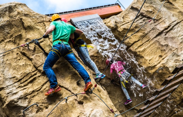 Klettern in der Outdoor-Bergwelt (10 Kletterrouten am Felsen, 8 Erlebnishöhlen, 1000 natürliche Griff- und Trittstrukturen, 7m hoher Wasserfall, Gipfelkreuz mit Gipfelbuch)
