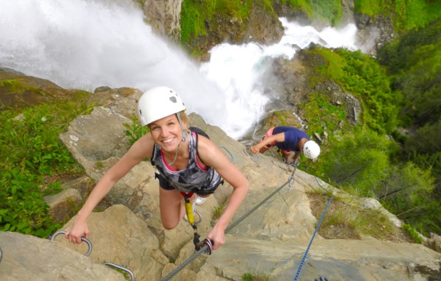 Gemeinsam geht es mit dem Kleinbus zum Klettersteig. Dort angekommen könnt Ihr Euren Augen kaum trauen. Schon unten hört Ihr das Rauschen des Wasserfalls. Ihr könnt es kaum abwarten die Felswand hochzuklettern. Meter für Meter geht es weiter in die Höhe. Mit jedem weiteren Griff steigt die Aufregung und das Bauchkribbeln. Oben angekommen wird der Aufstieg mit einer atemberaubenden Aussicht belohnt. Ihr seid über jeden Schritt, den Ihr gemacht habt, froh und jede Anstrengung ist bei dem Anblick über die Landschaft vergessen. Fangen die Finger vor Aufregung schon an zu kribbeln?