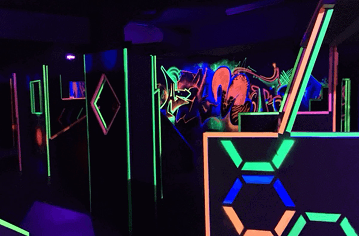 Lasertag in moderner Arena mit verschiedenen Spielflächen und Spielelementen