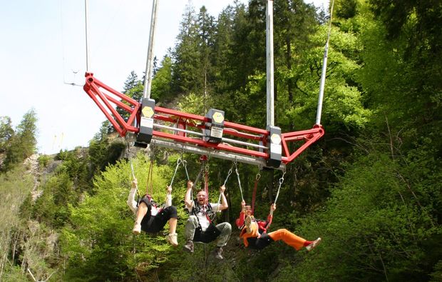 Vor dem Schaukeln in dieser Höhe erfolgt ein Sicherheitscheck aller Teilnehmer. Zu Dritt dürft ihr euch mit Tragegurten fachmännisch befestigt komplett sicher fühlen und den Adrenalinrausch genießen. Aber ihr springt nicht wie beim Bungee Jumping von der Brücke. Eure Schaukel ist hier befestigt und wird mit den Teilnehmern in Position gezogen. Wie früher, wenn die Eltern einen beim Schaukeln angestoßen haben, nur zigfach größer, schneller und rasanter. Am höchsten Punkt erreicht, darf einer von euch bestimmen wann es losgeht. Hast Du die Nerven Dich und Deine Freunde aus der Halterung zu klinken, um mit enormer Geschwindikeit durch die Baumwipfel des Lesachtals zu fliegen? Zu spät um auszusteigen, denn es geht schon los: Wow! Was für ein Gefühl! Das Adrenalin rauscht, der Wind bläst euch durch die Haare und es ist ein Wahnsinnsfeeling. Die Riesenschaukel schwingt mit Leichtigkeit durch die Luft und ihr genießt diese Freiheit.