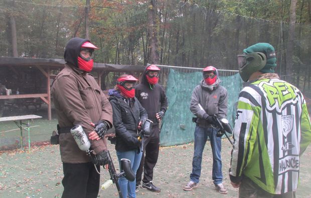 Nachdem Du in Simmern angekommen bist, meldest Du Dich an und ziehst Dich um. Im Anschluss wirst Du dann von einem erfahrenen Schiedsrichter in das Spiel und in die Bedienung der Markierer eingewiesen. Wenn Du alles verstanden hast, geht es weiter zur Ausgabe, wo Du die erforderliche Ausrüstung erhältst. Du wirst mit einer Maske, einem Markierer, dem Battlepack und einer Druckluftflasche, die kostenfrei nachgefüllt werden kann, ausgestattet. Bei Deinem Markierer sind bereits 500 Paints enthalten – diese sind im Preis inbegriffen! Bist Du ausgerüstet, geht es weiter zum Schießstand: Hier feuerst Du ein paar Probeschüsse ab und Du erhältst weitere Erklärungen zur Ausrüstung, insbesondere zum Markierer. Auf einem kleineren Spielfeld versuchst Du Dich bei einem kurzen Spiel im Paintball.