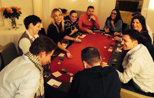 Und so kann deine Pokernight ablaufen: Während die Gäste eintreffen und die Tische sowie das Equipment aufgebaut werden, hast du genügend Zeit für einen kleinen Aperà². Anschliessend steht der Croupier für alle Spielerklärungen ausführlich zur Verfügung. Denn du musst kein Profi sein um hier dein Spiel machen zu können. Dann startet die Pokernight. Fullhouse, Flush, Drilling? Welches Pokerblatt ist nochmal das Stärkste? Und was passiert wenn zwei Spieler jeweils zwei Paare haben? Wer gewinnt? Um all diese Fragen zu beantworten werden nun ein paar Trainingsdurchläufe gespielt bis sich alle Gäste regelsicher fühlen. Nach diesem Einblick in die professionelle Pokerwelt ist jetzt vielleicht der geeignete Zeitpunkt für eine Dinnerpause? Gestärkt und motiviert geht es nun in die heisse Phase des Gameduells. Das Pokerturnier startet! Wie gut kennst du deine Freunde und Familie? Durchschaust du deren Bluffs oder lässt du dich gnadenlos abzocken? Die Poker Challenge wird zeigen wer die besten Nerven hat.