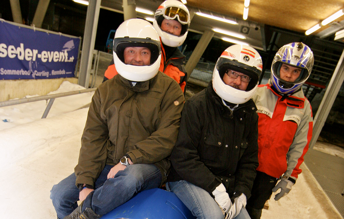 Beim Rennbob handelt sich um einen Viererbob. Du sitzt zusammen mit Deinem Rennbobpartner zwischen dem Profipiloten und dem Bremser.