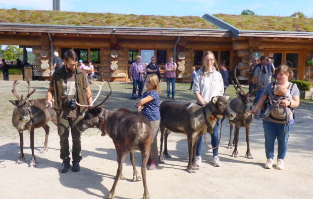 Die nordischen Hirsche von der Gattung der Tundra-Rentiere haben ihren ursprünglichen Lebensraum in Lappland, fühlen sich aber auch im deutschen Reinhardswald, im Norden Hessens, wohl. Hier leben sie in einer kleinen Herde und warten auf Eure gemeinsame Wanderung. Wusstet Ihr, dass männliche Rentiere ihre Geweihe Anfang Dezember abwerfen, während die Weibchen ihre kleineren Geweihe den ganzen Winter lang behalten? Dieses, und noch mehr interessantes am und um das Rentier erlebt ihr „live“.