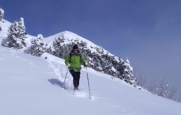 Die Schneeschuh-Wanderung am Riedberger Horn wird voraussichtlich etwa 7 Stunden Zeit in Anspruch nehmen – aber keine Sorge, Ausdauer ist zwar gefragt, Du musst Dich aber nicht komplett verausgaben: Hier wird gemütlich gewandert und es werden immer wieder kleine Pausen eingelegt – immerhin soll die fantastische Aussicht verzaubern und wirken! Ein erfahrener Guide begleitet Dich und die restliche Gruppe auf Eurem Weg in die schneebedeckte Bergwelt und ihre jungfräulichen Pfade und Wege. Morgens um 9 trefft Ihr Euch alle erst einmal am Parkplatz des Skigebiets Grasgehren. Nach einem kurzen Vorstellen und Kennenlernen weist Euch Euer Bergführer in die Ausrüstung ein. Schneeschuhe und Stöcke stehen Euch zur Verfügung – wer aber seine eigene Ausrüstung mitbringen möchte, kann dies selbstverständlich tun. Integriert ist auch ein Lawinenverschüttungssuchgerät, das Euch der Guide kurz vorstellt, auch bestimmte Erste Hilfe Griffe werden noch einmal geübt – jetzt kann nichts mehr schiefgehen und der Weg beginnt.