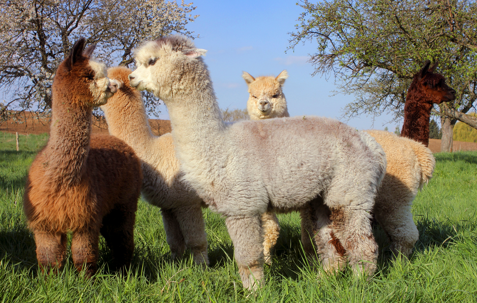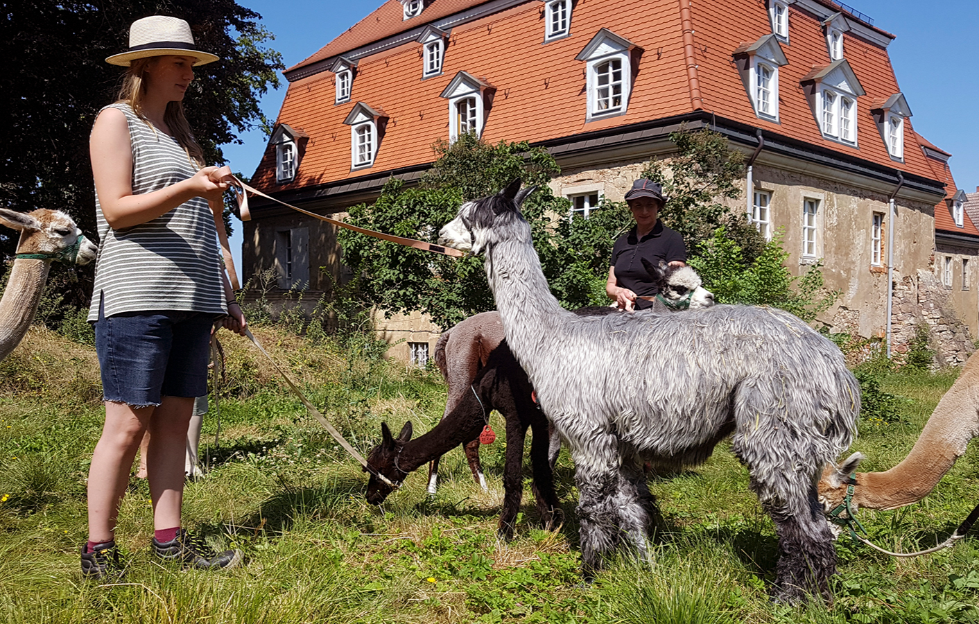Kaum seid Ihr am Alpakahof angekommen, seht Ihr schon die quirlige Alpaka - Herde. Die neugierigen Tiere kommen auf Euch zu. Ihr streichelt das weiche, flauschige Fell der Mini-Kamele. Dabei schauen Euch ihre niedlichen Kulleraugen an. Schon bekommt Ihr jeweils ein Alpaka zugeteilt und die Wanderung beginnt.