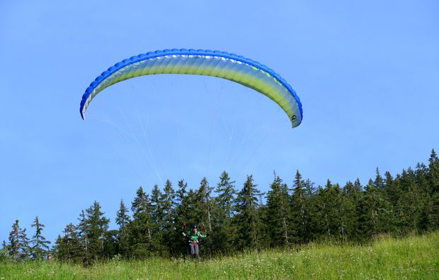 Bevor es aber in die Lüfte geht, wirst Du zunächst einmal die Ausrüstung kennenlernen. Denn selbstverständlich sollst Du auch wissen, was da alles um Dich rum hängt und baumelt. Darüber hinaus ist es nie falsch, das Material zu kennen, damit man persönlich sieht, dass man sich wirklich darauf verlassen kann. Nachdem Du Dich mit dem Material vertraut gemacht hast, wird auch schon mit den ersten Übungen begonnen. Jetzt lernst Du die richtige Lauftechnik für den Start und wirst verschiedene Steuerübungen und auch Aufziehübungen absolvieren.
