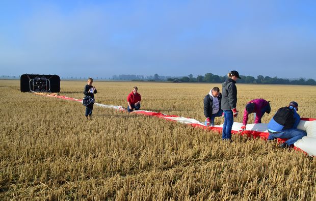 Der Ablauf einer Ballonfahrt beginnt mit dem Auslegen der Hülle und dem Zusammenbau des Korbes mit Zubehör. Sobald die Hülle mit heißer Luft gefüllt wurde und sich zu ihrer vollen Größe emporhebt, steigst Du in den Ballon ein.