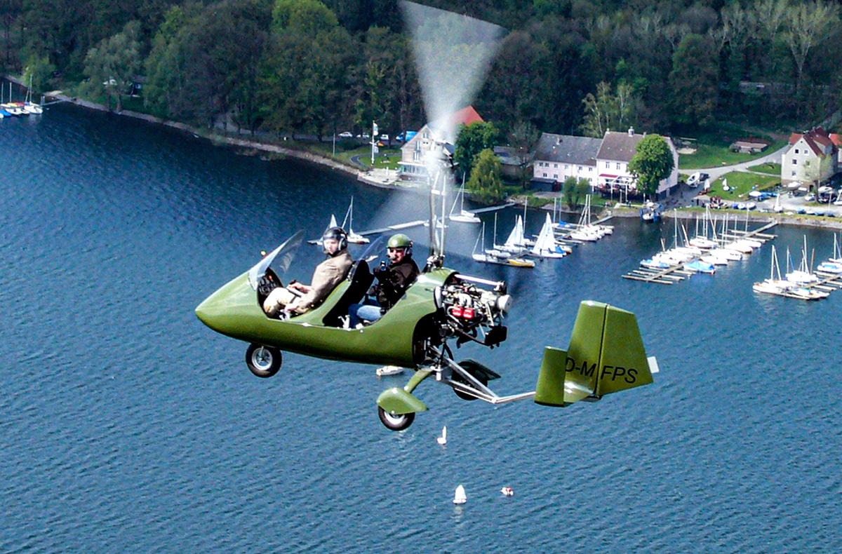 Schon beim Start spürst Du das aufregende Kribbeln im Bauch, während sich der Tragschrauber sanft in die Luft erhebt. Und schon geht es hoch hinaus! Der Gyrocopter wird hauptsächlich vom Fahrtwind angetrieben und reagiert kaum auf Turbulenzen. Genieße, wie der Tragschrauber sanft durch die Luft gleitet und Dir einen ganz besonderen Ausguck aus luftiger Höhe bietet.