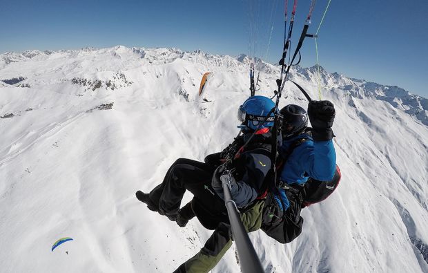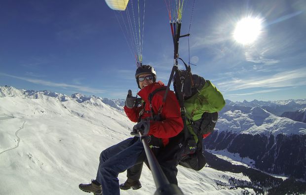 Beim Paragliding in Davos erwartet Dich ein Himmelsritt der ganz besonderen Art und ein echter Glücksflug! Dass das Fliegen am Gleitschirm jede Menge Glücksgefühle und Adrenalin freisetzt und man sich hinterher das breite Grinsen kaum noch aus dem Gesicht wischen kann, ist keine Überraschung. Doch dieses Event setzt noch einen drauf: Heute unternimmst Du nicht einfach nur einen kurzen Tandemflug, sondern es dreht sich einen halben Tag lang alles um Deine Leidenschaft Fliegen. Vier Stunden lang wirst Du von einem langjährigen Profi und erfahrenen Lehrer unterrichtet, geschult und mit auf ein Abenteuer hoch oben am Himmel genommen, das Du ganz bestimmt nicht mehr vergessen wirst! Neben spannenden theoretischen Ausführungen und wichtigen Informationen, die Du erhältst, hast Du am Himmel dann auch die Möglichkeit, selbst zu lenken, spektakuläre Flugmanöver zu fliegen oder einfach ganz in Ruhe die Aussichten zu geniessen – heute läuft alles ganz nach Deinen Wünschen ab. Ausserdem werden beim Paragliding in Davos zahlreiche Fotos gemacht, die Dir hinterher zur Verfügung stehen. Treffpunkt ist zunächst die Basisstation in Davos. Zusammen mit Deinem Tandempiloten schultest Du dann die Ausrüstung und Ihr macht Euch per Bergbahn auf zum Hochplateau – schon jetzt werden Dir die traumhaften Aussichten den Atem rauben. Nach einer theoretischen Einweisung, einigen praktischen Übungen zu Start- und Landemanövern geht es dann endlich los: Du läufst die letzten Meter mit festem Boden unter den Füssen – und dann hebst Du ab! Ein unglaubliches Gefühl, wenn sich die Landschaften unter Dir ausbreiten und Du hoch oben darüber hinwegschwebst!