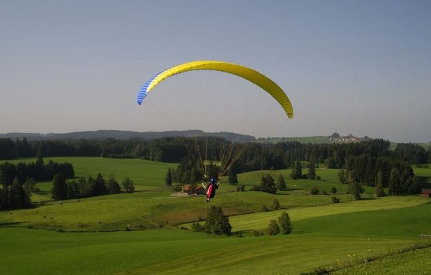 Entdecke die grenzenlose Freiheit aus der Vogelperspektive und erlebe das Hochgefühl des Fliegens beim Gleitschirm-Schnupperwochenende in Marktoberdorf.