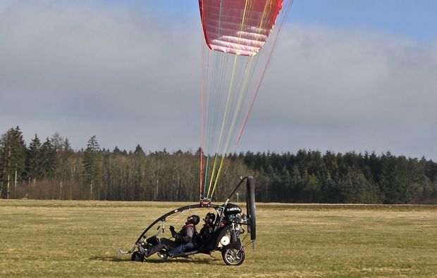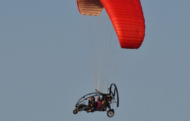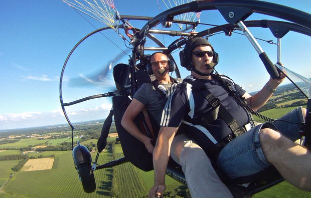 Ein Motorgleichschirm ist ein offen gebauter Zweisitzer, an dem ein Motor und ein Gleitschirm befestigt sind. Der Rundflug mit dem außergewöhnlichen Fluggerät startet und endet in Hörsten. Bist Du hier angekommen, wirst Du von dem freundlichen Piloten begrüßt. Nachdem Ihr Euch miteinander bekannt gemacht habt, bekommst Du von ihm eine theoretische Einweisung in das Motorgleitschirm-Fliegen. Dabei erklärt er Dir alles Wichtige zu diesem Fluggerät und gibt Dir einige Sicherheitshinweise zu Deinem Motorgleitschirm-Rundflug!