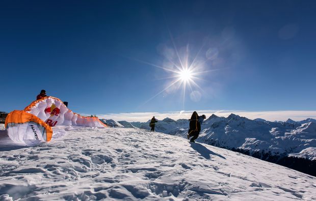 Dein Tag beim Paragliding in Davos startet zunächst mit dem Kennenlernen des Piloten in der Basis. Zusammen schultert Ihr Ausrüstung und Equipment und macht Euch per Bergbahn auf zum Ort des Geschehens – ein entlegenes Hochplateau. Schon bei der Auffahrt werden Dir die rasend schönen Aussichten die Schuhe ausziehen! Oben angekommen erhältst Du nun eine ausführliche Einweisung in den Gleitschirmsport. Von Start- und Landeübungen über Ausführungen zur Sicherheit und Technik bis hin zu Infos über Thermik und Auftrieb erfährst Du viel Wissenswertes und Interessantes über das Paragliding. Und dann geht es endlich los: Ihr lasst die Karabiner klicken, überprüft ein letztes Mal alle Details und macht die letzten Schritte bis zum Abgrund – ein wahnsinniges Gefühl, wenn Deine Füsse den sicheren Boden verlassen! Jetzt gibt es nichts anderes mehr als Dich, traumhafte Aussichten auf die Landschaften unter Dir und das einmalige und unvergleichliche Gefühl, zu fliegen!