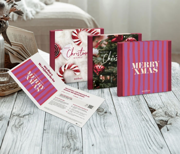 Mit einer von sechs Grußkarten kannst Du Deinem mydays Erlebnis-Geschenk eine ganz persönliche Note hinzufügen. Nachdem Du Dich für ein Bild entschieden hast, das die Karte zieren soll, bietet die Rückseite ausreichend Platz zum Verfassen Deiner ganz persönlichen Grußbotschaft an Deine Mitarbeiter oder Kunden.
