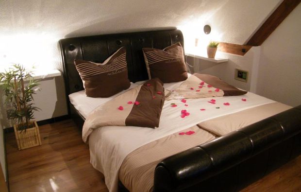 - Romantikspecial inkl. (Leih-)Deko, 1 Flasche Sekt, Rosenstrauß, Rosenblätter auf Bett und Boden, Teelichter entzündet auf dem Weg zum Bett als Wegbegrenzung und ein romantischer Kuchen für 2