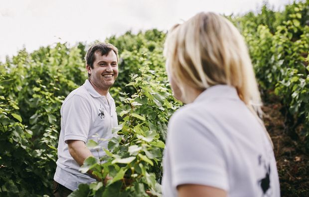 Los geht die Weinverkostung Guldental für Dich mit einem prickelnden Glas Prosecco zur Begrüßung. Du machst Dich mit den weiteren Seminarteilnehmern bekannt und lernst dabei auch den geschulten Weinexperten kennen, der Dich professionell durch die Weinverkostung führen wird. Zu Beginn des genussvollen Geschmackserlebnisses steht eine interessante und spannende Gutsführung und Begehung des Weinkellersan. Der Experte erklärt Dir mit seinem umfangreichen Fachwissen den Weg der Trauben von der Lese bis in die Flasche. Damit Dir die Theorie nicht zu trocken vorkommt, startet währenddessen bereits die Weinverkostung.