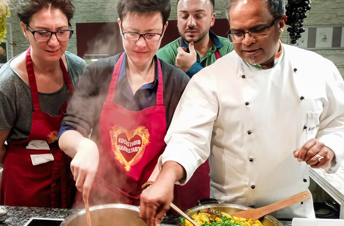 Lass Dir zunächst den Begrüßungsdrink schmecken, bevor Du einen ersten Blick über die bereitliegenden, teilweise ungewohnten Zutaten schweifen lässt. Was wohl alles in den farbenfrohen Gewürzen stecken mag... In den kommenden vier Stunden wirst Du es herausfinden! Eine mit der indischen Küche bestens vertraute Expertin stellt Dir und Deinen Mitstreitern nun zunächst den Ablauf des Abends vor und informiert Dich über die Besonderheiten der indischen Speisen. Du nimmst die einzelnen Zutaten unter die Lupe, lernst die Herkunft und Möglichkeiten der Verarbeitung kennen und spürst nebenbei, wie Dein Appetit zunimmt... Jetzt ist es eindeutig Zeit, das neue Wissen beim Kochkurs Indische Küche in Darmstadt auch in der Praxis auszutesten! Unter Aufsicht und mit Unterstützung der Köchin bereitet Ihr ein 2-3-gängiges vegetarisches Menü zu, das anschließend natürlich gemeinsam verkostet wird. Lass Dir die geschmackliche Vielfalt auf der Zunge zergehen! Alle Getränke zwischendurch vom Wasser über Säfte und Kaffee bis hin zum Wein oder Bier sind beim Kochkurs Indische Küche in Darmstadt selbstverständlich inklusive.