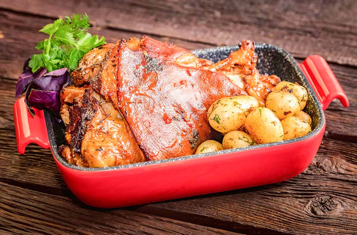 Zubereitung von: Obatzda mit Bio-Bauernbrot, Kartoffelsuppe mit geräuchertem Speck, klassischer Schweinsbraten mit Schwarzbiersauce, Rahmwirsing & Semmelknödel, Apfelstrudel mit Vanillesauce