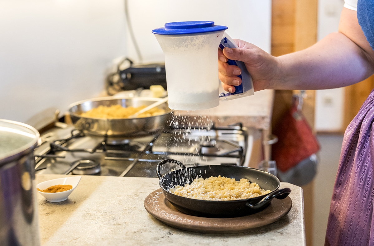 Gemeinsames Zubereiten des traditionellen Miasl (süß & sauer) in der Hüttenküche
