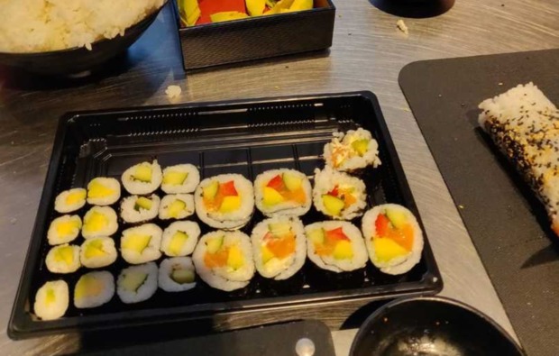 gemeinsame Verkostung der gefertigten Sushi am Ende des Kurses