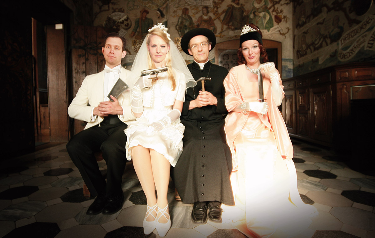 Bereits das Burghotel Schnellenberg birgt die ideale Kulisse für einen Krimi im Stil der 60er Jahre. Hier bekommst Du das Gefühl, als seist Du in einem echten Edgar Wallace Krimi gefangen und gehst gemeinsam mit dem Chief Inspector auf Verbrecherjagd. Bei Deinem Krimidinner in Attendorn stehen fünf verschiedene Theaterproduktionen zur Auswahl, sodass Du Dich überraschen lassen kannst, welches interaktive Theaterstück Dich erwartet. Bei stimmungsvollem Kerzenlicht und einer eindrucksvollen Kulisse eröffnet sich Dir eine ganz besondere Atmosphäre. Gehe auf Täterjagd, wenn bei der Familie Ashtonburry ein Verbrechen geschieht und Du gemeinsam mit den Darstellern die Indizien sammelst und den Geheimnissen auf den Grund gehst. Beweise Dein kriminalistisches Gespür und ermittle bei Deinem Krimidinner in Attendorn wie Miss Marple. Bist Du auf der richtigen Spur oder wurdest du durch falsche Beweise getäuscht? Bei diesem interaktiven Theaterstück bist Du ein Teil der Vorstellung, wenn es vier Stunden lang um Spannung und ungelöste Fälle geht. Diese sind zudem auch sehr humorvoll angelegt, sodass auch Deine Lachmuskeln ordentlich angeregt werden.