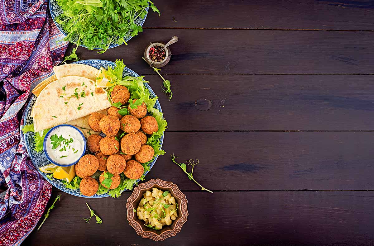Zubereitung von: Mezze-Trio aus Hummus, Baba Ghanoush & Muhammara mit frischem Fladenbrot, Falafel-Bällchen mit Minz, Joghurt und Granatapfelkernen, Lammkarree mit orientalischer, Chermoula und geschmortem Gemüse, Baklava mit Nüssen & Honig