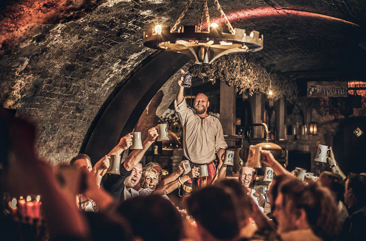 Was steht auf dem Menü beim Rittermahl? Ritter waren körperlich tätig, viel unterwegs auf dem Pferderücken und hatten anspruchsvolle Aufgaben. Wenn sie nach Hause kamen, hatten sie einen Bärenhunger und deshalb sind die Portionen beim Ritteressen üppig. Für Euch wurde ein authentisches 3-Gänge-Menü kredenzt – auf dem Speiseplan stehen deftige Gerichte wie Rinderkraftbrühe, Zwiebelschmalz mit Steinbrot, Haxe vom Schwein, Hähnchenschlegel oder Schweinerippen mit Honig. Bringt also ordentlich Appetit mit zum Ritteressen und genießt den Abend im Burgkeller!