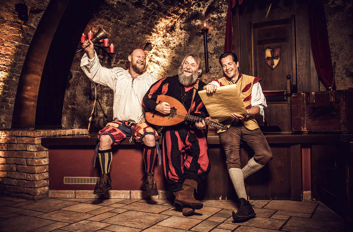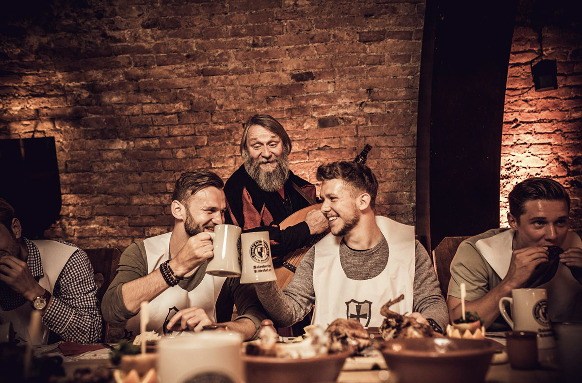 Beim Ritteressen ist nicht nur das Mahl selbst ein eindrucksvolles Erlebnis. Das Drumherum vermittelt Euch den Eindruck wirklich im Mittelalter gelandet zu sein! Ihr werdet begrüßt und zu Euren Plätzen an einer langen, rustikalen Tafel gebracht. Im Keller brennen Fackeln, ihr entdeckt eine Ritterrüstung und der Tisch ist gedeckt mit schweren Krügen und massivem Geschirr. Wo seid Ihr denn hier gelandet?