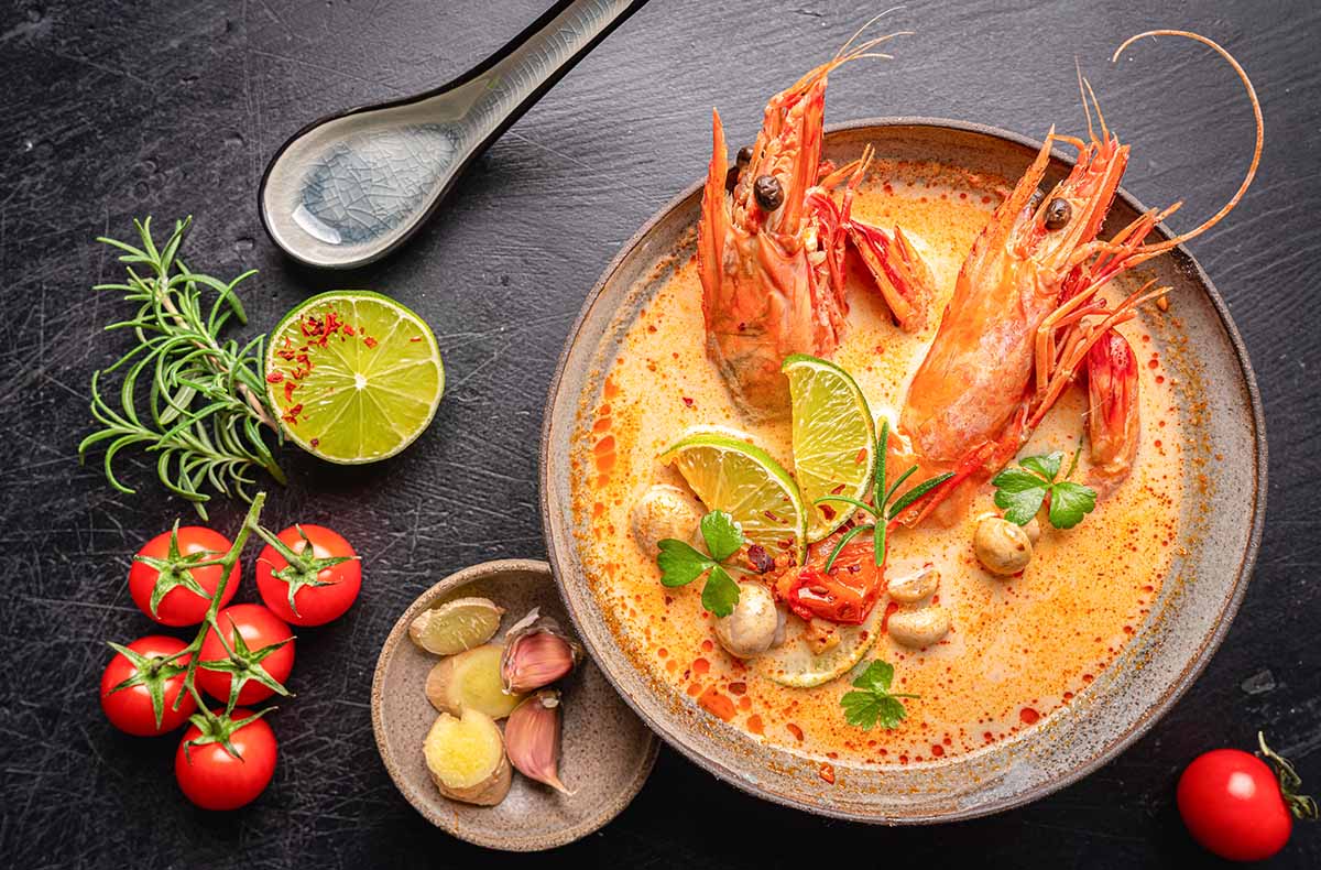 Zubereitung von: Tom Yum Goong (würzige Garnelensuppe), knusprigen Frühlingsrollen, Som Tam (Papayasalat), grünes Curry mit Gemüse & Kokosmilch, Klebreis mit Mango