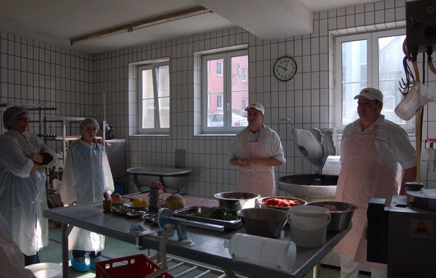 Du selbst wirst nun das Brät in die Naturdärme füllen und die Weißwürste per Hand portionieren. Am Anfang bedarf es hier noch ein wenig Fingerspitzengefühl, doch mit ein bisschen Übung wirst Du schnell das nötige Gefühl aufbringen und im Handumdrehen schöne Weißwürste formen können. Selbstverständlich steht Dir die gesamte Zeit der Metzgermeister mit Rat und Tat zur Seite.