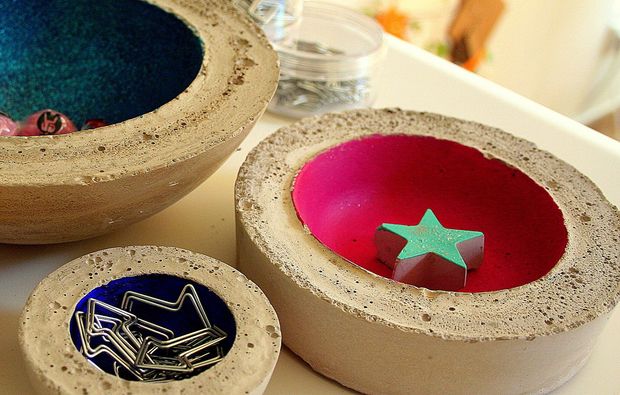 Nun geht es ans Eingemachte: Gieße Deine ganz individuellen Formen aus Beton! Egal ob Kerzenhalter, Schalen, Blumentöpfe, Briefbeschwerer, ... – Du kannst Deine Objekte nach Herzenslust gestalten, denn im Atelier wartet eine große Auswahl an Formen und Zusatzmaterialien auf Dich. Lass Deiner Kreativität freien Lauf! Verpasse zum Beispiel Deinen Objekten mit Farbe und Lack den letzten Schliff. Auch kannst Du Deine Werke veredeln, indem Du Schlagmetall in den Beton gießt oder gleich aus „schick“ mit Metallösen oder Fotohalter-Klemmen „praktisch“ machst. Deiner Fantasie sind hier keine Grenzen gesetzt!