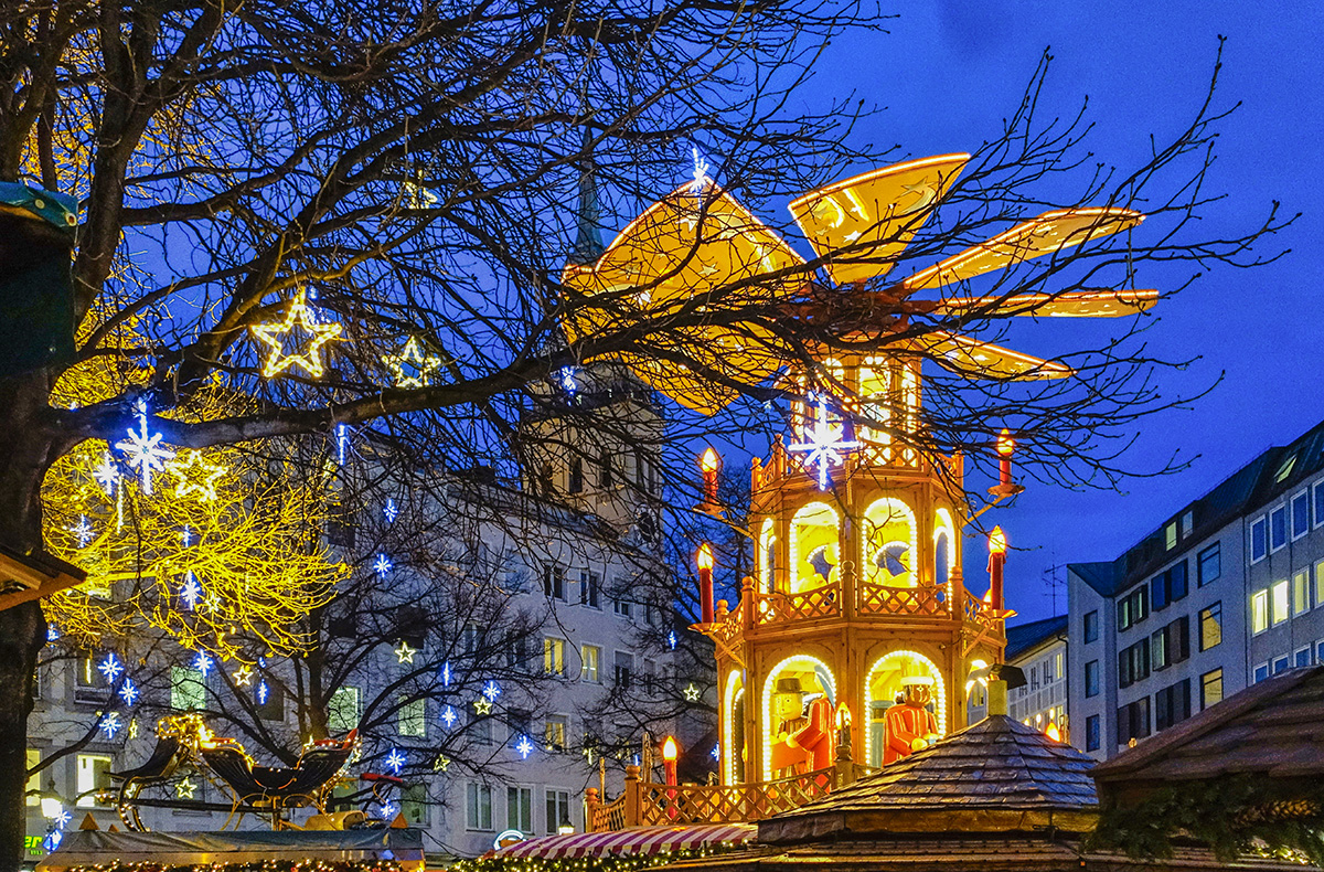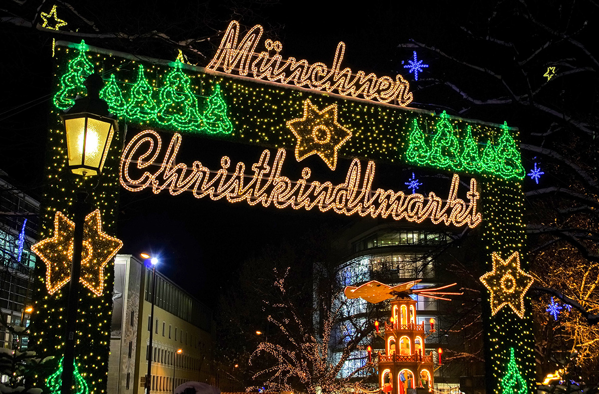 Probiere dich durch Münchner Köstlichkeiten auf dem Weihnachtsmarkt, z.B. Glühwein, Münchner Bier, gebrannte Nüsse, Feuerzangenbowle, Kartoffelpuffer
