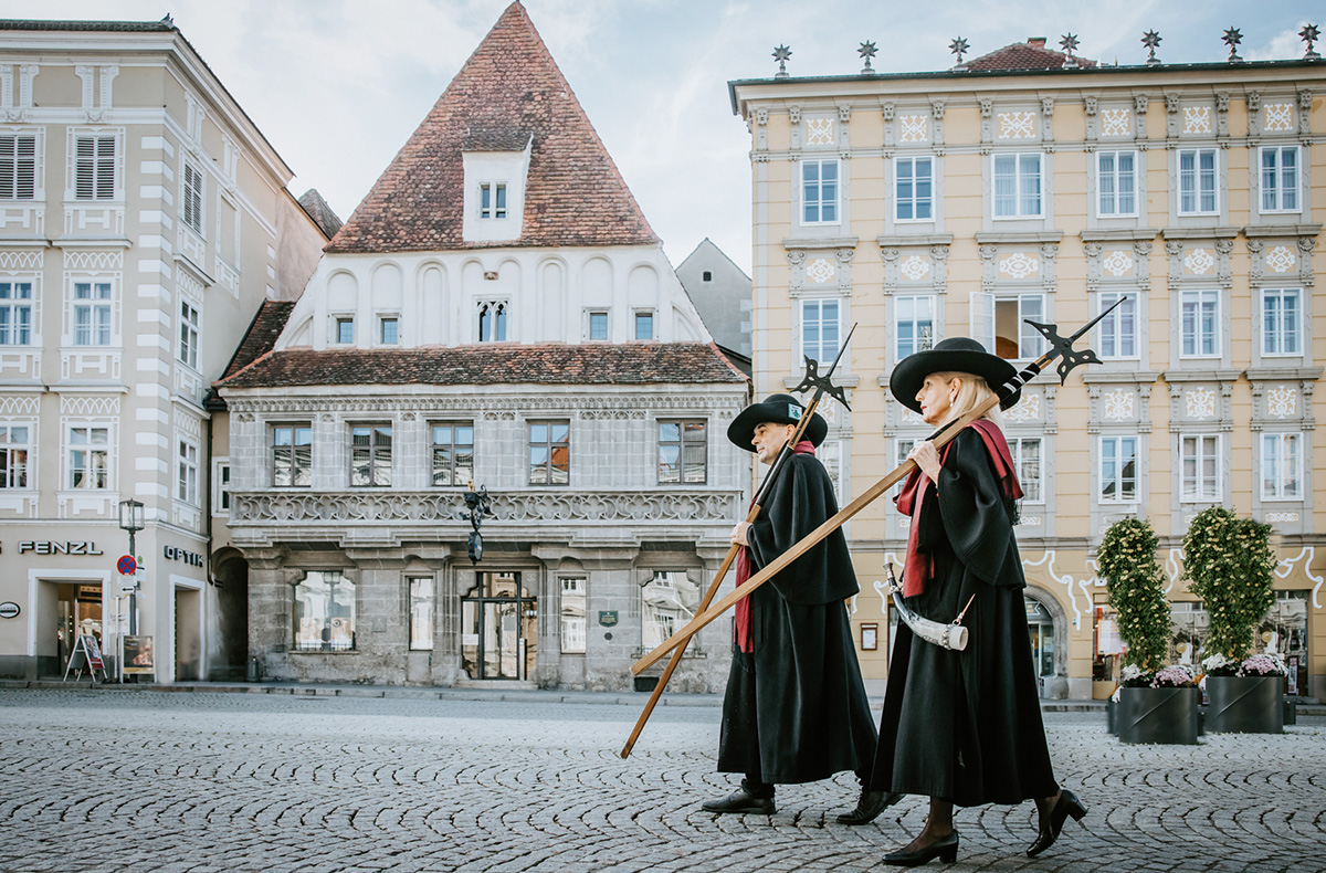 Auf der Kulinarischen Stadtführung Steyr hast Du die Gelegenheit, allerhand zu entdecken, etwa die lauschigen Innenhöfen im mittelalterlichen Zentrum oder das gotische Bummerlhaus. In der 1000-jährigen Stadt Steyr in Oberösterreich finden historische Architektur, Kultur und Lifestyle zusammen und ergeben einen unvergleichlichen Mix. Steyr sprüht mit seinen vielen Kirchen und Schlössern nur so vor Historie. Das Zusammentreffen der Flüsse Enns und Steyr sorgt für eine ganz besondere Lage der Stadt. Doch damit nicht genug: Der Ort ist auch für seine lange kulinarische Tradition und Gastfreundschaft bekannt. Besonders Wert gelegt wird dabei auf den regionalen Bezug der Speisen. Auf der Kulinarischen Stadtführung Steyr hast Du die Möglichkeit, die vielfältige gastronomische Szene der Stadt kennenzulernen und sie mit deinen eigenen Sinnen zu erfahren. Du wirst von den Nachtwächtern an ganz besondere Orte in Steyr entführt und kannst in die spannende Geschichte der Romantikstadt eintauchen. Die musikalische Untermalung durch mittelalterliche Instrumente sorgt dabei für eine tolle Kulisse, welche Dir noch lange im Gedächtnis bleiben wird.