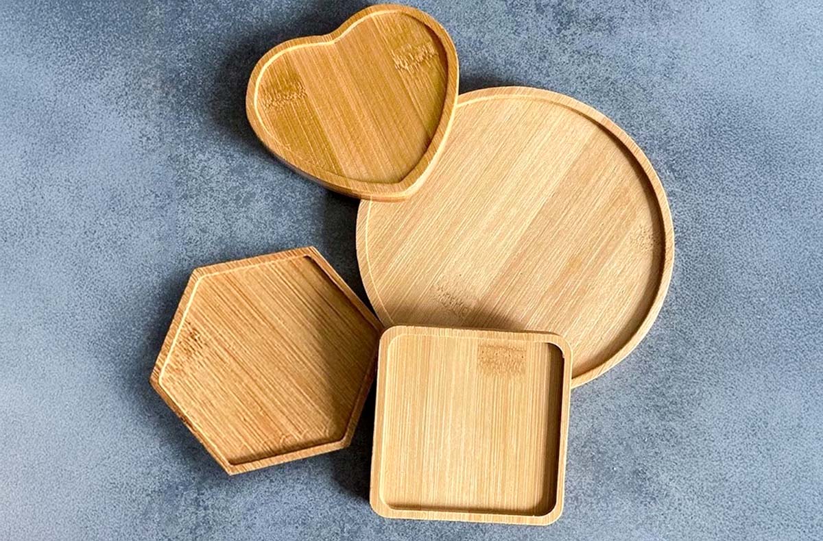 Große Auswahl an Mosaiksteinchen, verschiedene Formen an Holzuntersetzern und verschiedene Größen an Tabletts