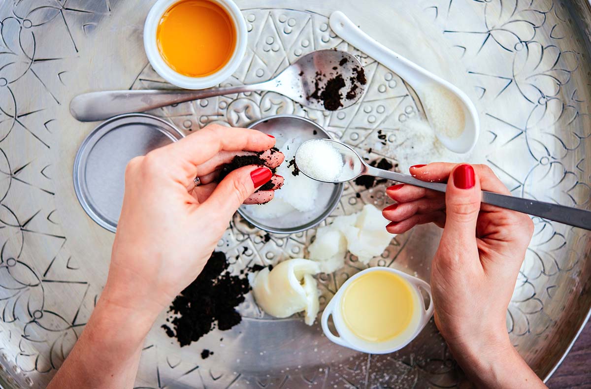 Rühren einer eigenen modernen Gesichtspflege mit Aloe Vera, Hyaluronsäure und wertvollen Bio-Ölen
