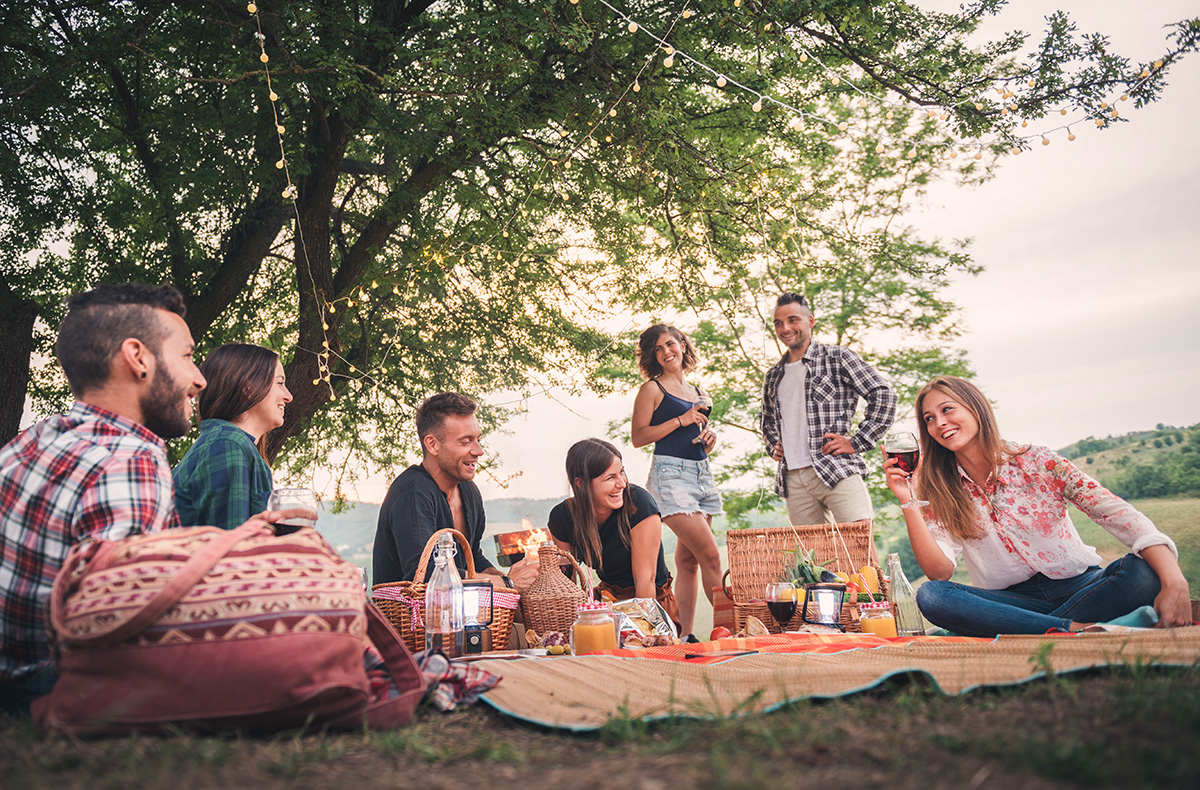 - Gefüllter Picknickkorb mit deftigen Speisen und Getränken