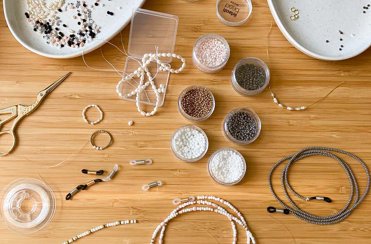 Alle benötigten Materialien für Ketten, Ringe oder Brillenketten mit einer großen Auswahl an bunten Perlen