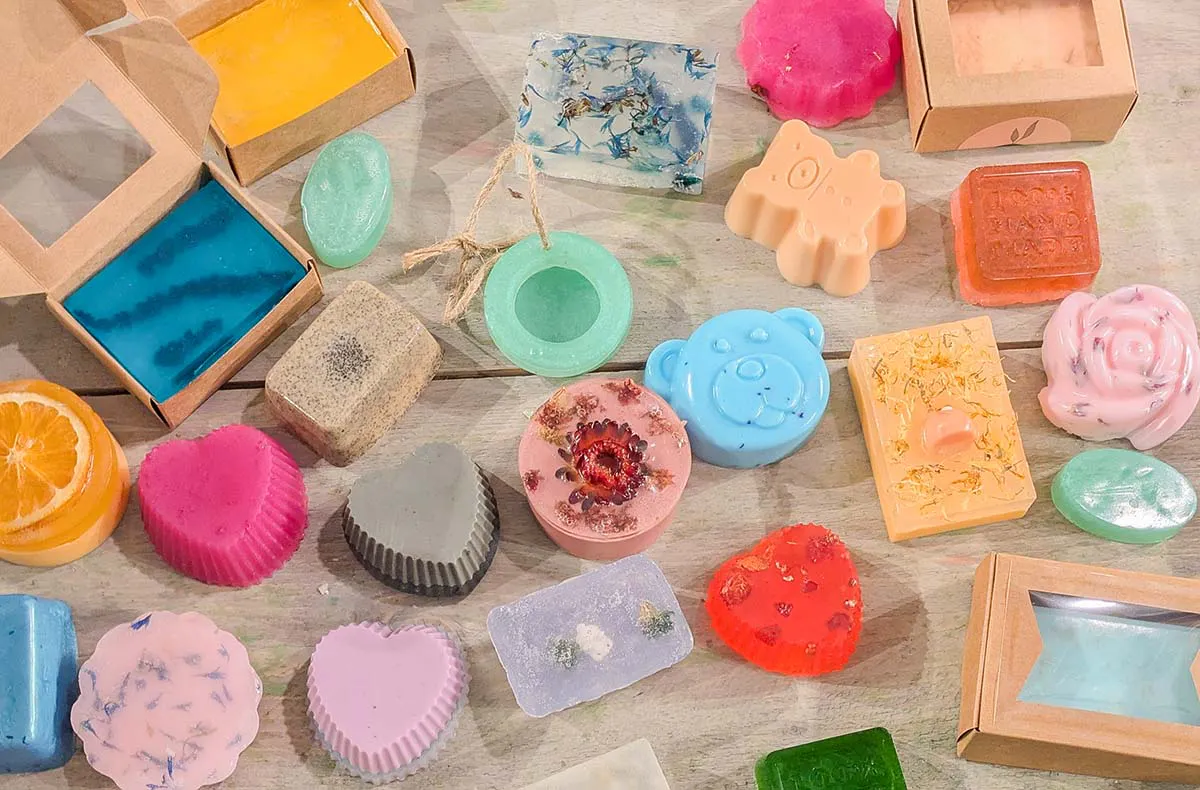 Auswahl aus Silikonformen, Naturfarben & Seifenfarben, Ätherischen Ölen (Lavendel, Eukalyptus oder Grapefruit) und Dekoelementen