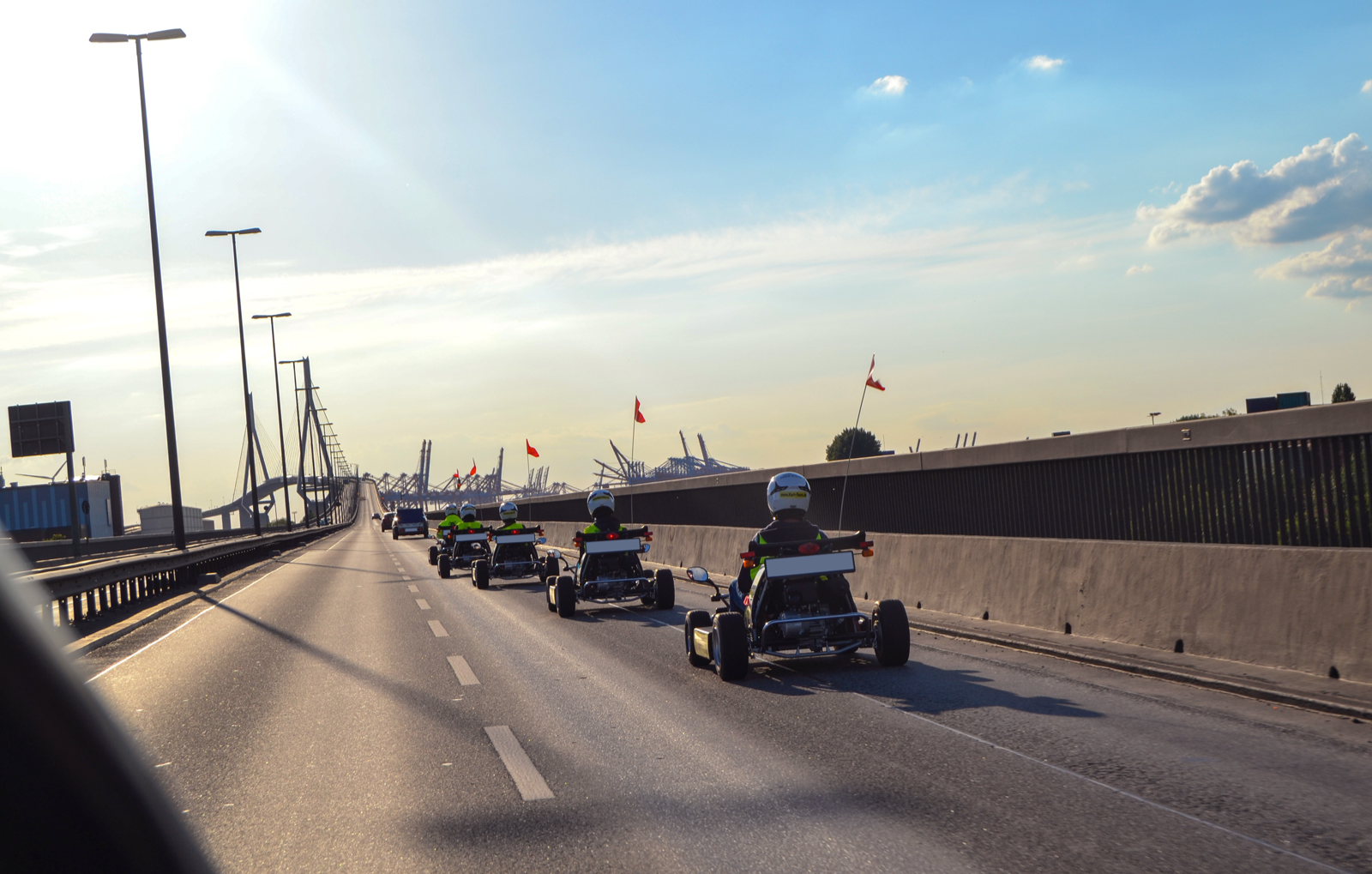 Doch bevor Du auf die Tube drückst und im Straßenkart eine der wohl außergewöhnlichsten Stadtrundfahrten Hamburgs erlebst, bekommst Du eine kurze Einführung in das Fahrzeug. Ein Fachmann zeigt Dir, wie der kleine Flitzer zu bedienen ist, wie die Funkanlage funktioniert und auf welche kleinen Besonderheiten Du beim Fahren achten musst. Außerdem bekommst Du noch einen Helm, damit Du beim Gas geben im Kart rundum geschützt bist. Die ersten Minuten Deiner Sightseeingtour finden noch im Hafen, abseits vom Stadtverkehr statt. So kannst Du Dich ganz in Ruhe mit Deinem Fahrzeug vertraut machen und ein Gefühl fürs Fahren bekommen.